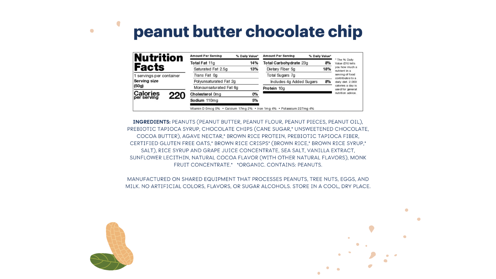 A heavenly balance of savory & sweet, our peanut butter chocolate chip protein bar is packed full of chunky peanut butter, real semi-sweet chocolate morsels, & a touch of oatmeal and brown rice.